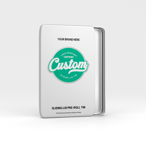 CR pre-roll tin featuring a sideways sliding lid that locks into CR notches when closed. Customized sizing and branding are available. Standard S...